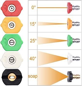 Máy rửa xe áp lực cao thường được trang bị nhiều loại béc phun, phân biệt bằng màu sắc và góc phun. Trong số đó, béc màu trắng (40°) và xanh lá (25°) là lựa chọn an toàn cho hầu hết các bề mặt như xe, sân vườn, hàng rào hay tường gạch. Trước khi vệ sinh toàn bộ, hãy thử trước ở một góc khuất để kiểm tra áp lực. Hạn chế tối đa việc dùng béc đỏ (0°) trừ khi thực sự cần vì loại này tạo tia nước cực mạnh, có thể gây bong sơn, nứt gạch hoặc làm hỏng lớp phủ bảo vệ.